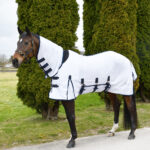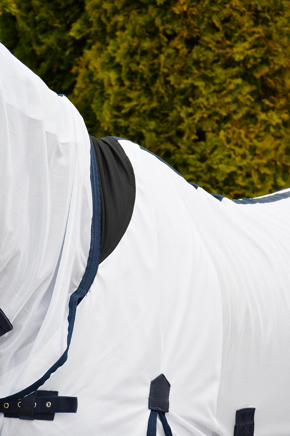 The full neck design provides maximum coverage from UV and insects, featuring a lycra insert at the withers for unmatched comfort and to allow for greater movement. The double chest buckles allow for this fly rug to remain as lightweight as possible. Lined over the mane, wither, and the shoulder, with anti-static fabric to enhance hygiene and comfort, promoting good coat health, and reducing the risk of rubbing.