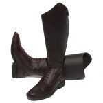 These luxury brown long riding boots are made in soft feel leather giving the upmost comfort to the wearer. They feature an elasticated front lace detail and stitch detail on the toe cap. With a user friendly wider smooth feel zip pull and two pleated, elasticated leather sections at the back of the boot for a comfortable fit. The top of the zip is finished off with an elasticated strap and a press stud to the side. With spur guards and a sure grip sole these boots are practical as well as gorgeous to wear. The EW Luxus is styled with a wider calf and shorter fit.