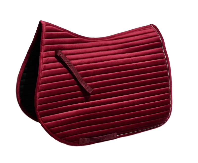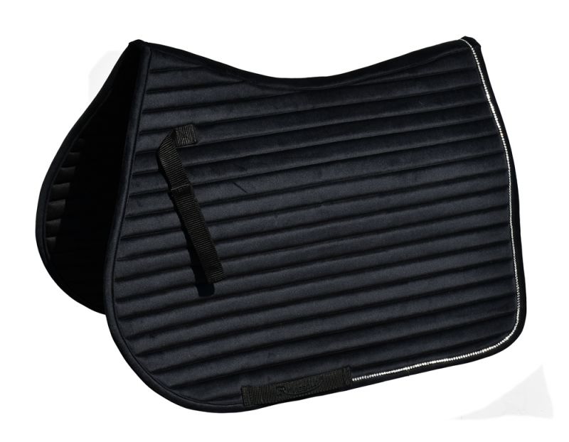 Luxury velvet GP saddle pad with channel design quilting enabling a super comfortable fit around the horse. With touch tape fasten girth secure straps and girth placement straps. Fully breathable lining. Self- colour Rhinegold embroidered logo to girth strap. Finished with diamante trim to complete this luxury look.
