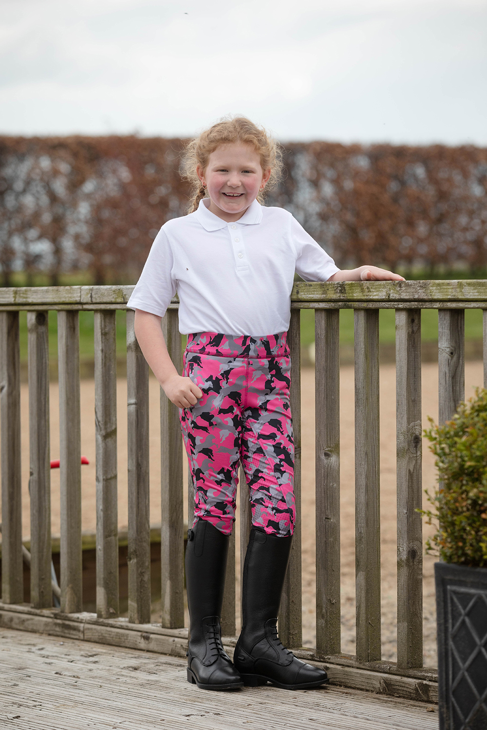 These equestrian riding tights are in a fun pony print with a silicone grip full seat and full inside leg. Pull on style horse riding tights with a stretchy, soft waistband for comfort and a zip side pocket.