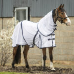 Mesh fly rug with detachable neck designed to reduce nuisance from flies. The soft mesh material does not rub and features cross-over surcingles, double chest straps, cotton towelling spine section for comfort, front shoulder movement pleat, leg straps and tailguard. Comes complete with a detachable neck cover. Our best-selling, great value summer rug!