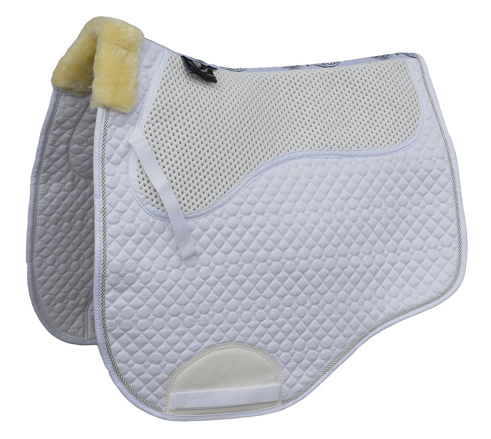 This non slip saddle cloth is made complete with its cotton outer, faux fur trim and shock absorbing non-slip panel. Touch tape girth placement straps and Anti-rub girth panel.