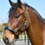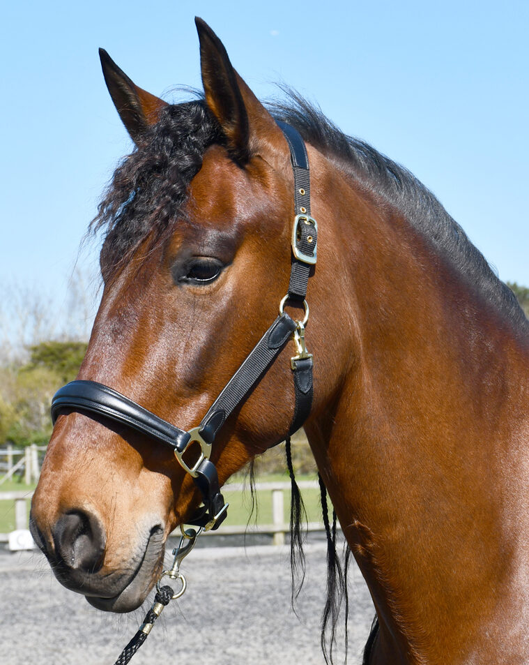 Beautiful Webbing and Leather Headcollar. These head collars for horses are anatomically shaped to curve at the horse’s ears and fully softee leather padded and finished at the crown, noseband, throat piece, and the cheeks.