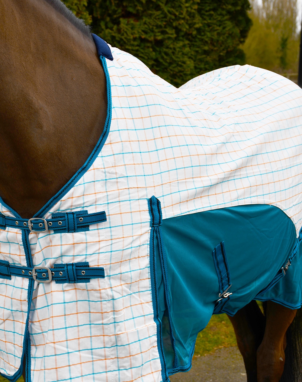 A fresh-looking summer sheet for horses, with a mesh body for additional ventilation.