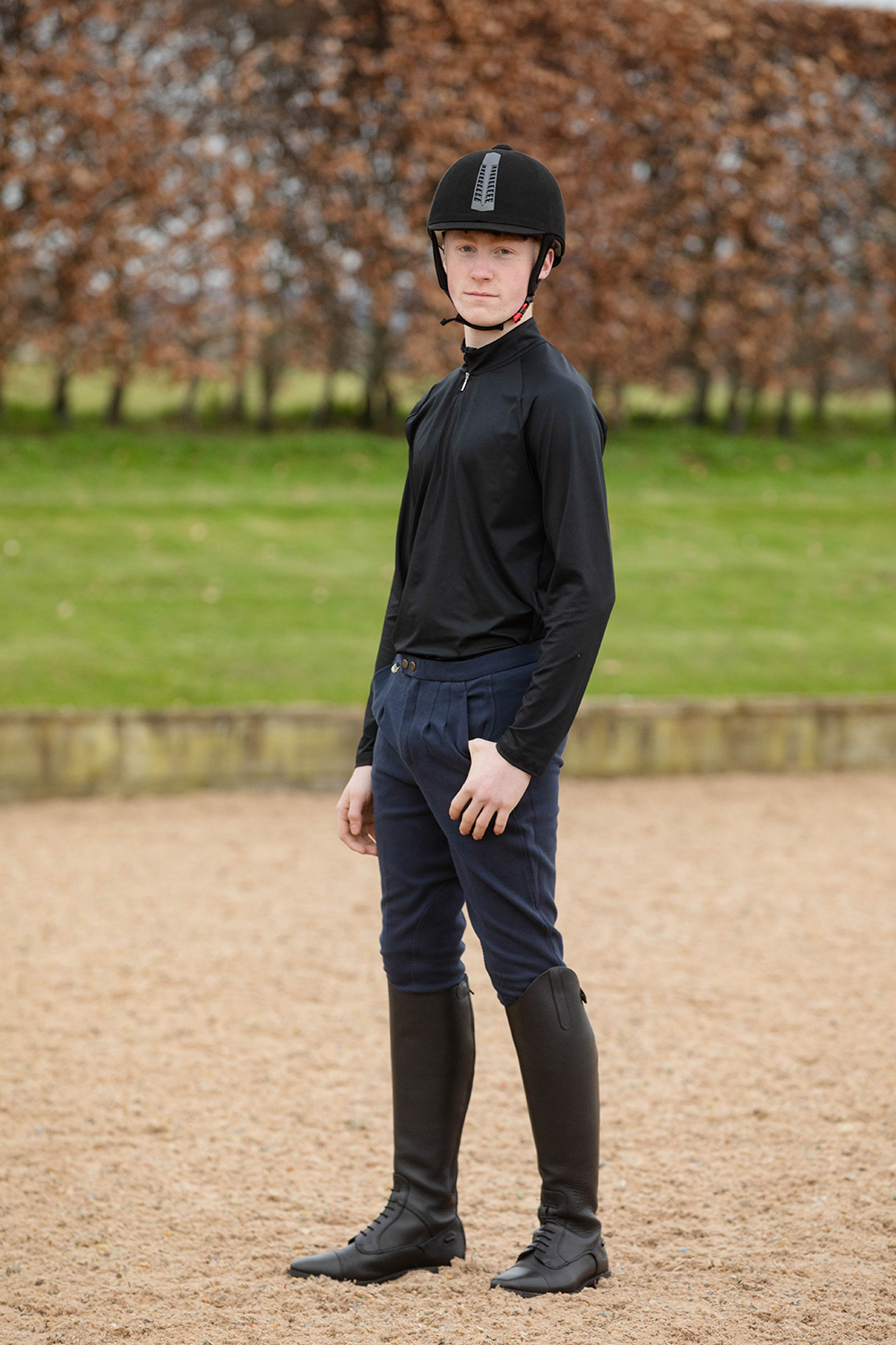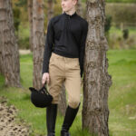 These traditionally styled men’s horse riding breeches are darted at the front with two side pockets for a smart relaxed look. With a front zip, double button fastening and enamel logo badge to the side and branded inner waistband. Made from 95% Cotton/5% Spandex these Breeches are comfortable on the skin and allow maximum movement in and out of the saddle. Styled with traditional knee patches and finished with touch tape closure at the ankle.