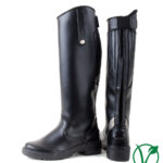 These wider fitting long boots are made from a synthetic (non-peel) material fully lined with full length centre back zip, tab closure to the side and an elasticated rear panel for size variation. The use of this stretch panel makes these boots ideal for a wide range of leg shapes and ensures more flexibility in the leg whilst you are riding. There is also a neoprene join above the foot to ease bending and help prevent stress on the boot. With reflective inserts at the heel for increased visibility and a non-slip sole for safety.