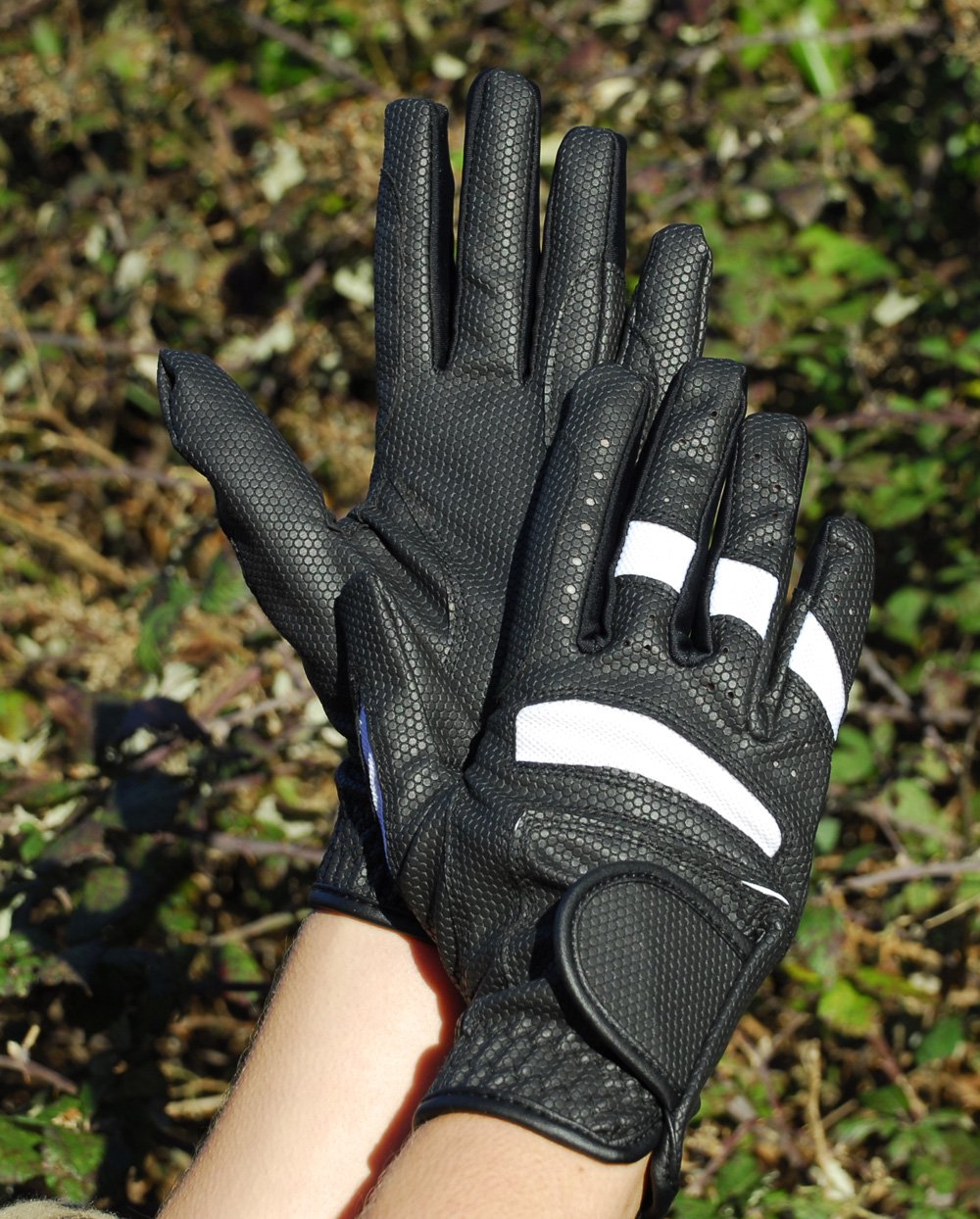 Synthetic stretch horse riding gloves with a non-slip feel and mesh inserts to the fingers and knuckles for extra movement and breathability. Lycra inserts between the fingers and an additional Lycra vent detail for comfort on the back of the hand. With additional strengthening for riding on the index and little finger and an elasticated Touch Tape closure at wrist for security. These gloves for riding horses are easy to wear and are a perfect fit for riding.
