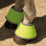 Neoprene equine bell boots in bright yellow with double-touch tape closure and dayglo reflective piping around top and bottom of boot. Highly visible for road use.