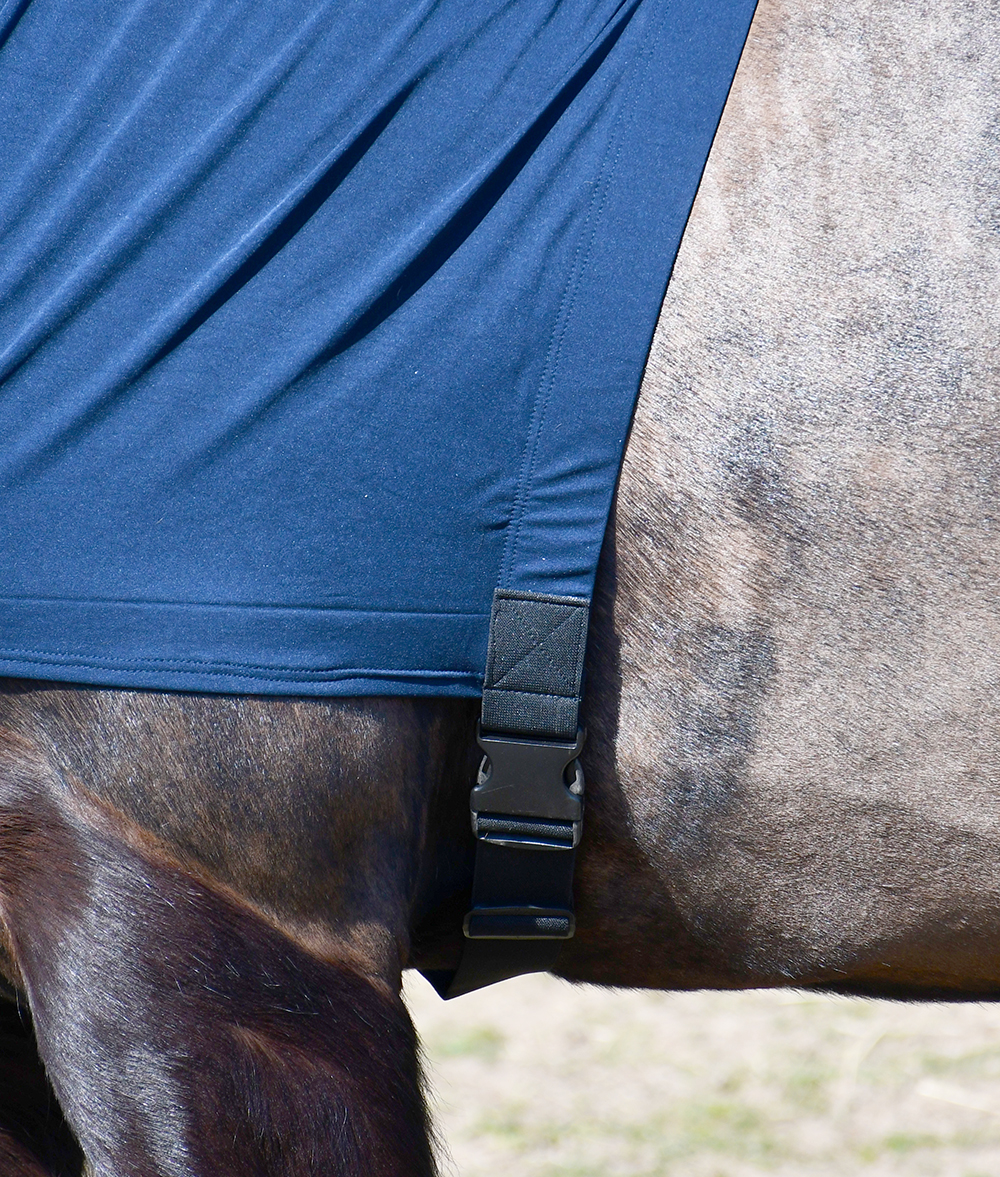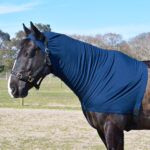 Full horse neck cover, with girth strap, robust neck zip with zip guard, and holes for ears.