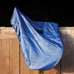 Waterproof ride on saddle cover with slits for stirrup leathers. Can be used for riding or storing saddles.